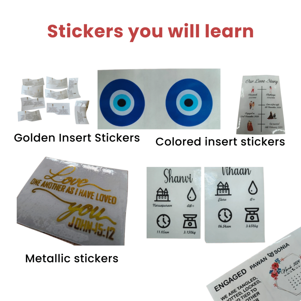 👉 All about machines- which machine to use for which type of sticker, how to use the machine. Tips and tricks. Dos and don’ts. Learn to make insert sheet, make golden embossed/clear sticker and make small stickers.